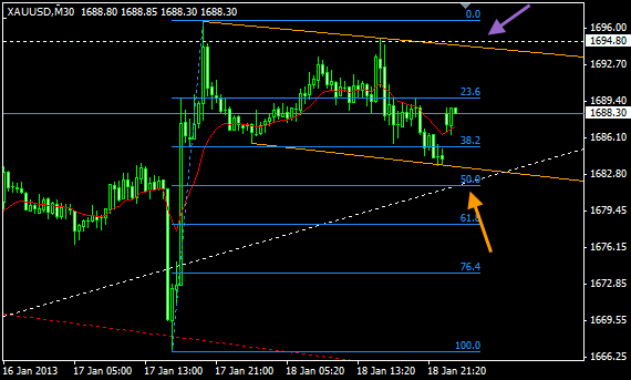 Pada intraday chart terlihat harga emas membentuk falling channel yang juga berpotensi menjadi bullish flag. Batasan channel tersebut (kini di 1683.46 dan 1694.48) akan menjadi wilayah pergerakan harga emas pagi ini. Sementara itu area resistance yang signifikan tetap berada di area 1695 hingga 1701.