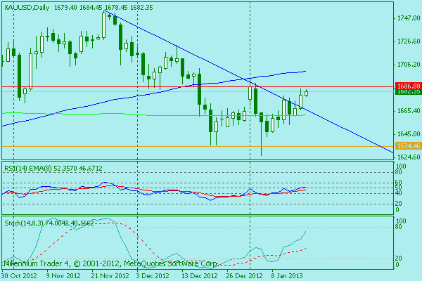 Bullish harga emas kemarin berhasil ditutup di atas garis tren resistance dengan gerak intensif. Harga emas ditutup di 1679.25. Analisa harga emas hari ini diperkirakan berpotensi menembus resistance 1686.90 untuk menuju target resistance 1694.80. Indikator teknikal RSI dan stochastic mendukung harapan bullish untuk menguji level resistance tersebut. Peluang koreksi menguji support 1674.75 masih ada, namun kami perkirakan support ini menjadi pijakan bagi emas untuk naik lebih tinggi.
