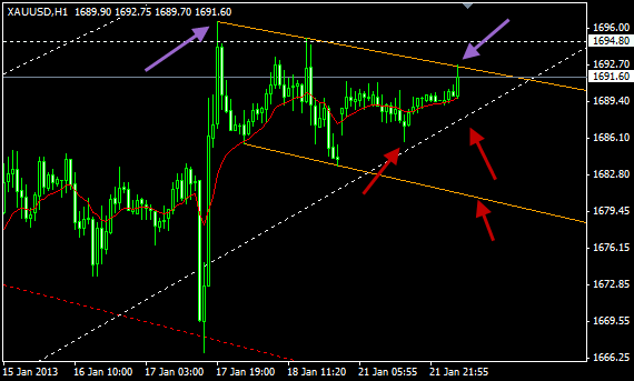 Batasan atas channel saat ini sedang diuji (1692.70) dan batasan bawahnya kini berada di 1681.05. Kemungkinan besar pagi hingga siang ini harga emas tidak akan bergerak jauh.